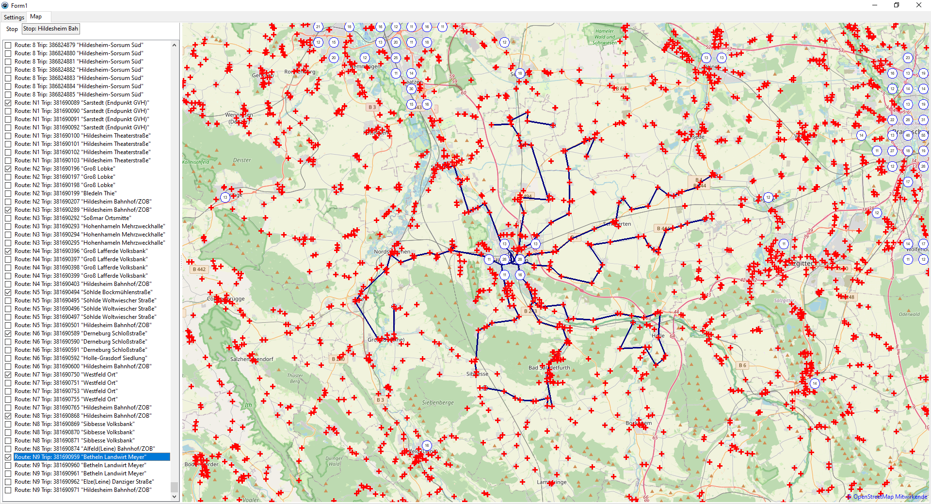 Beim Laden des Datensatzes "Nahverkehr Deutschland" verwendet das Programm bis zu 16,4GB, danach (Ladevorgang abgeschlossen) 12,8GB. Das ist vermutlich dem Einlesen der großen Datei stop_times.txt (=1,3GB) in eine Stringliste geschuldet. Praktisch für die Programmierung, in der Speichernutzung eher unhandlich. Vielleicht bastele ich da mal was Besseres.
