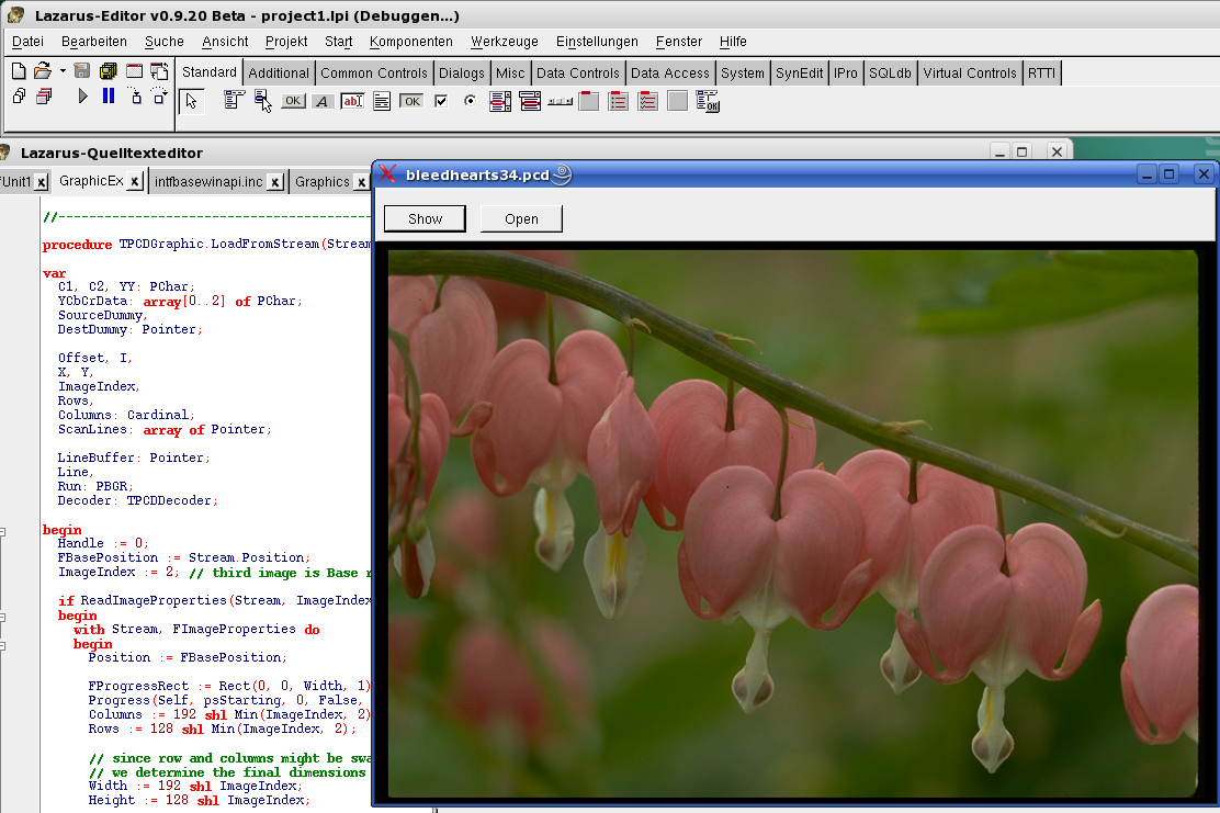 Zur allgemeinen Erheiterung: Hier mal ein Screenshot: Lazarus lädt nativ ein Kodak Photo CD Bild (Übersetzung der GraphicEx von Mike Lischke)