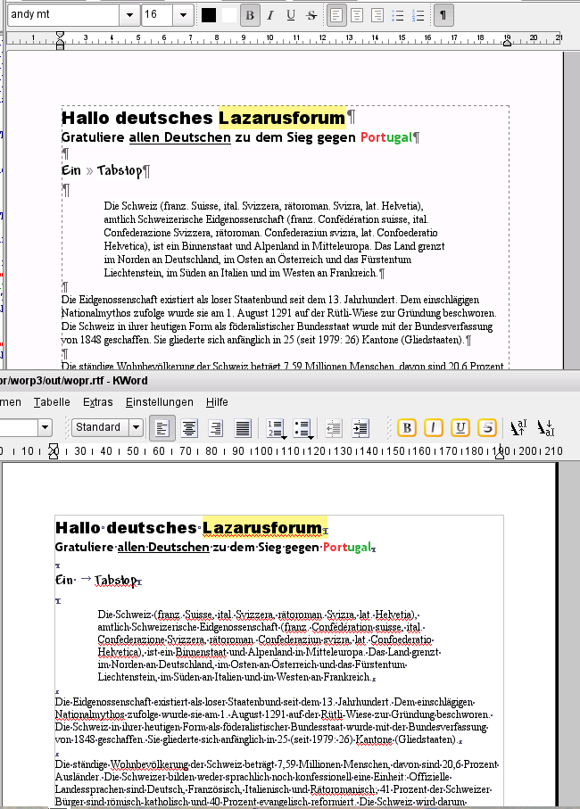 Es tut aber auch ein bisschen gut, zu sehen das WOPR OpenOffice Text in Positionsrahmen wenigstens anzeigt (wenn auch an falscher Position) während KWord (in 3.5.5) diese einfach verschluckt und dem User vorenthält.