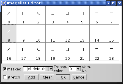 'Save', lade die gespeicherte Datei im imagelist Editor, 'stretch' muss dabei ausgeschaltet sein. In der Imagelist sind die Ecken/Kanten im Gegenuhrzeigersinn angeordnet. Es sind 3*8 bitmaps für die drei Zustände "normal", "hoover" und "gedrückt". Die bitmaps 6, 14 und 22 müssen ersetzt werden.