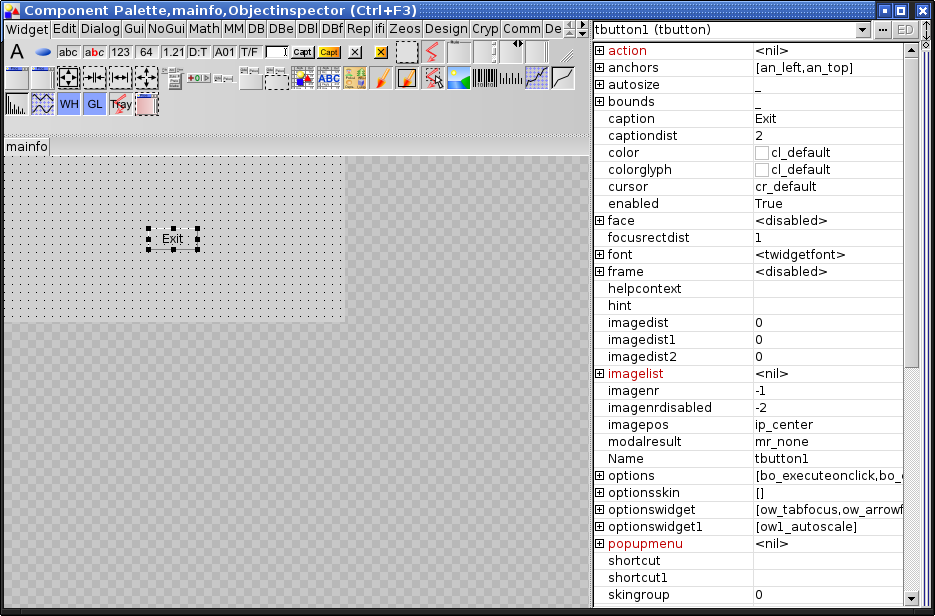 Ich hatte versucht, daß so ähnlich wie in Delphi 5 aussehen zu lassen. Oben links die Hauptbuttons (Run, Step Into usw.) rechts daneben die Komponentenpalette darunter auf der linken Seite den Objektinspektor, rechts daneben den Source und ganz unten die Messages.