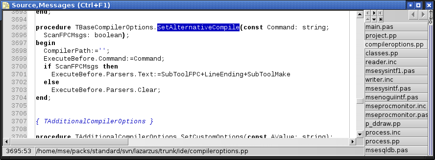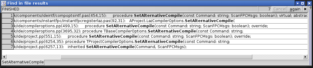 wo die abstrakte Definition von SetAlternativeCompile() steht. AProject.LazCompilerOptions ist wahrscheinlich vom Typ TLazCompilerOptions daher zeigt Lazarus die Definition TLazCompilerOptions.SetAlternativeCompile(). Dass zur Laufzeit AProject.LazCompilerOptions eine Instanz von TBaseCompilerOptions oder TProjectCompilerOptions (Zeile 6 von 'Find in file result') ist, kann Lazarus nicht wissen.