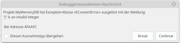 Vielleicht sollte man noch erwähnen, dass der Exception-Typ, hier EConvertError, nun in der Liste der Sprachausnahmen erscheint - siehe "Werkzeuge" > "Einstellungen" > "Debugger" > "Sprachausnahmen". Es ist wichtig zu verstehen, dass es sich hier um eine projektspezifische Einstellung handelt, obwohl sie mitten unter all den allgemeinen Lazarus-Einstellungen aufgeführt ist - das verwirrt mich immer wieder, zumal es bei Delphi 7 anders ist und die Einstellung für andere Anwendungen übernommen wird (was m.E. total unpraktisch ist).