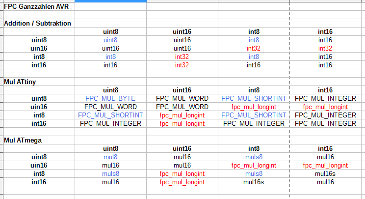 - Es werden an vielen Stellen, wo früher die nativen mul Befehle des Controllers verwendet wurden 8- und 16bit Variablen auf 32bit aufgebläht und eine Funktion fpc_mul_dword aufgerufen.