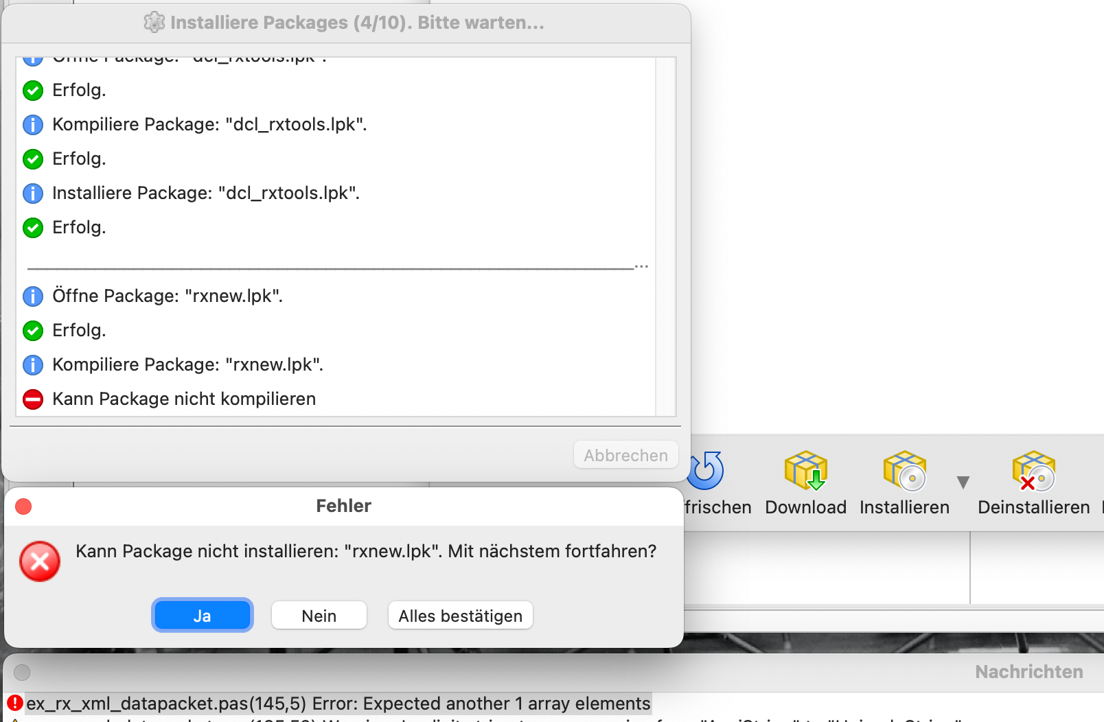 Aber generell: Wenn so eine Meldung kommt, kannst du eigentlich abbrechen, da alle folgenden Packages auf diesem einen aufbauen. Lade das nicht installierbare Package (hier: rxnew) in die IDE (Package > Open package file) und übersetze es dort. Wahrscheinlich kommt nun auch wieder ein Fehler, aber spezifischer, und du siehst die fehlerhafte Zeile. Ein beliebter Fehler bei RX ist die Erweiterung der TFieldType-Aufzählung in neuen FPC-Versionen. Wenn du das fehlerhafte Package reparieren konntest, kannst du die folgenden Packages manuell installieren. Die Reparatur des packages im Bugtracker berichten.