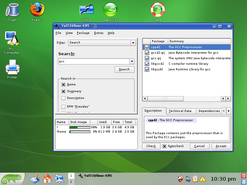 ich habe Schwierigkeiten, den gcc Compiler mit Hilfe von Yast zu installieren. Bzw. Ich finde den gcc nicht einmal :-( Ich habe mal einen Screenshot angehängt. Es sieht so aus, als ob nur Pakete gefunden werden, die schon installiert sind. Irgendwie sehe ich den Wald vor Bäumen nicht.