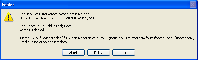 Der genannte Registrierungssdchlüssel sagt ja auch nur aus, das .pas-Dateien mit Lazarus geöffnet werden sollen. Seltsam ist nur, das du angeblich auf diesen Reg-Zweig keine Rechte hast. Das ist mir noch nie Unterkommen und ich arbeite nicht als Admn, aber du hast wohl sehr strenge Richtlinien gesetzt, bzw. eventuell nen program laufen, was die Registry überwacht?