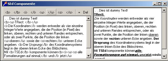 Ich habe gestern mal dieses Thema gelesen und da es immer mein Wunsch war so etwas wie RTF-Editor zu bauen habe ich mich hingesetzt und in 5 Stunden hatte ich etwas vernünftiges. Bisher sind Schrift-Attribute(fett, kursiv, unterstrichen, durchgestrichen, und alle 4 kombinierbar) umgesetzt. Zeilenvorschub und automatische Größenanpassung mit Scroller ist ok. Eingabe kommt zum Schluß, ist aber easy wenn ich mich entschieden habe wie es am Ende wirklich sein soll. Bisher war es zum Testen. Die Komponente ist so schön und praktisch geworden, dass ich mit ein Paar zusätzlichen Zeilen Code verschiedene Schriftarten, Bilder und Tabellen umsetzen kann. Die Komponente besteht selbst aus 262 Zeilen davon aber ca. die Hälfte Codes. Es ist mit Delphi erstellt aber werde später zu Lazarus anpassen. Ich arbeite zur Zeit schneller mit Delphi.