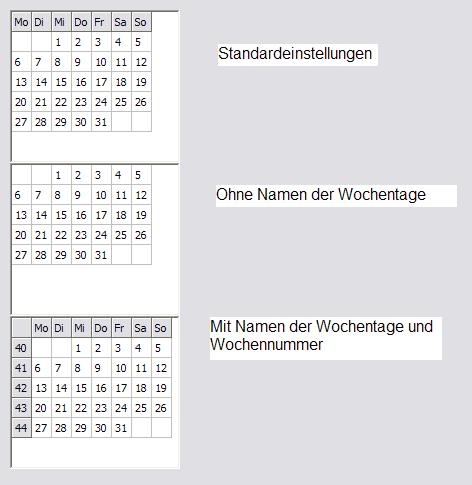 Ich bastel grade eine Kalender-Komponente auf einem TCustomStringGrid (kann sich auch auf ein TCustomDrawGrid ändern) basierend, da mir der bereits vorhandene Kalender misfällt. Wenn es dir also nur darum geht, die einzelnen Tage eines Monats darzustellen, kann ich dir den Quelltext mal zukommen lassen. Jedoch fehlen noch ein paar sachen wie Markierungen. Bisher ist verfügbar: