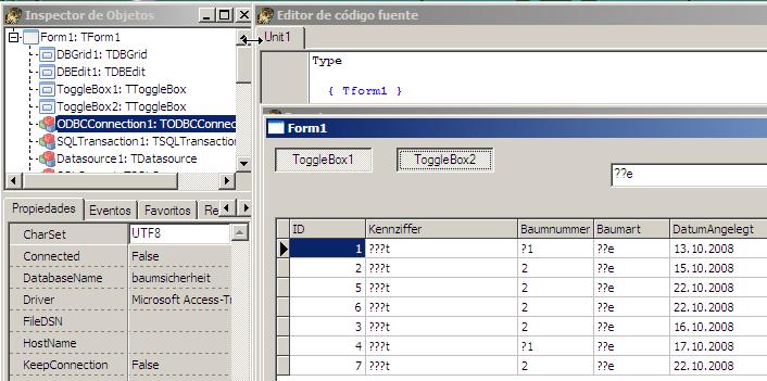 1.) Der Zeichensatz: ALLE strings (TStringField wird korrekt gesetzt) erscheinen sehr "chinesisch", habe überall "latin1" als CharSet eingestellt (bei TODBCConnection und unter Linux auch im ODBC-Data-Source-Administrator) aber das Resultat ist vernichtend... nicht nur bei Sonderzeichen sondern ALLE Buchstaben sind chinesisch (oder Thai, oder ...).
