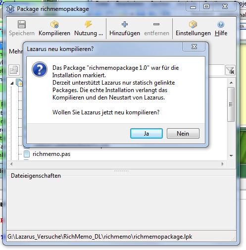 Zur Installation wählst du im Lazarus Hauptmenü Package -> Package-Datei (.lpk öffnen)... Dann suchst du in dem Verzeichnis, in welchem du die Quelltexte heruntergeladen hast, nach der Datei richmemopackage.lpk und klickst auf Öffnen. Im Package-Editor klickst du auf Nutzung... -> Installieren. Nach dem Neustart von Lazarus solltest du die Komponente unter Common Controls in der Komponentenpalette finden.
