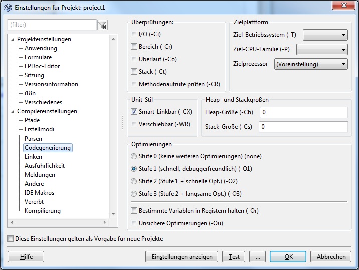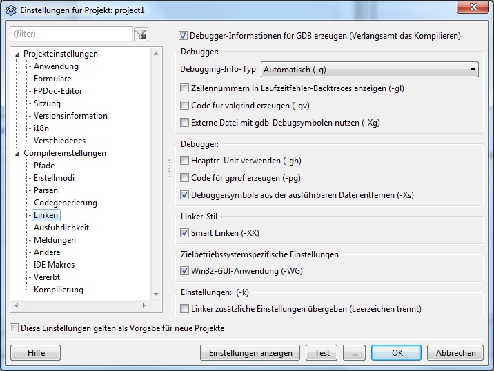 Die ersten Testprogramme mit Lazarus laufen prima, leider ist jedoch die Dateigröße der EXE bescheiden groß. Ich habe mich im Forum und bei Google über dieses Thema erkundigt und bin auch fündig geworden. Die Einstellungen habe ich entsprechend durchgeführt und Lazarus neu kompiliert. Leider hat sich an der Dateigröße, nachdem ich das Projekt neu kompilierte, nichts geändert. Immer noch ca. 14MB.