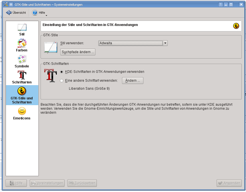 Mein Denkfehler. Jetzt klappt das!theo hat geschrieben:Wie ich oben schon geschrieben habe, gibt es unter OpenSuSE KDE spezielle GTK Stile.