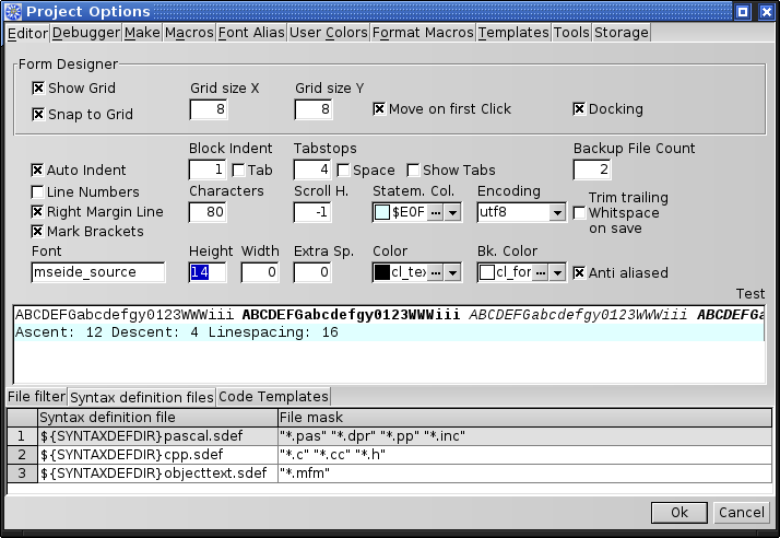 Der symbolische Font stf_default ist der Vorfahre aller verwendeten Fonts. Durch Starten von MSEide durch "mseide.exe --FONTALIAS=stf_default,,16" werden z.B. alle Fonts 16 Pixel hoch.