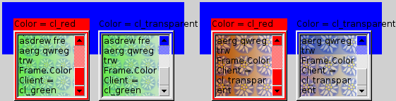 Der Textbereich aller Editwidgets wird mit TWidget.Frame.ColorClient gefüllt, cl_transparent macht diesen Bereich durchsichtig: Den inneren Bereich füllt auch TWidget.Face, welches teiltransparente Farbverläufe und teiltransparente Pixmaps anzeigen kann: Hinweis: TMemoEdit ist nicht für lange Texte gedacht. Der Text ist nicht zeilenweise organisiert; TMemoEdit ist ein normales TStringEdit mit Scrollbar. Bitte verwende als Texteditor TWidgetGrid mit TTextEdit als Spaltenwidget.