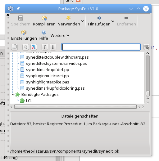 Wenn du die Package-Datei mit dem Package-Editor öffnest, muss unter Einstellungen / Package-Einstellungen / IDE-Integration die Option Package-Typ Entwicklungs- und Laufzeit gewählt sein. Alles andere lässt du unverändert, bis evtl.auf Package-Einstellungen / Beschreibung: Hier kannst du eine Kurzbeschreibung eintragen, so dass man eher versteht, wofür dieses Package gut ist: Wenn man es unter Package / Installierte Packages einrichten in die IDE installieren möchte, erscheint dieser Text zu dem Package unten im Formular; ansonsten müsste mit dem oft kryptischen Packagenamen vorlieb nehmen. Ist aber bei einem eigenen Package nicht unbedingt nötig.