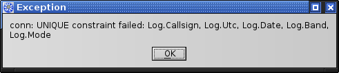 Vermutlich zweimal dieselben Daten eingelesen, dann gibt es einen Fehler im primary index -> es dürfen keine records mit identischen callsign,utc,date,band und mode Feldern existieren.