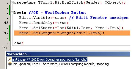 Memo1.SelLenght:=Lenght(Edit1.Text);BINGO!!!Teekeks hat geschrieben:Es heißt Length, da war ein Schreibfehler drinne...