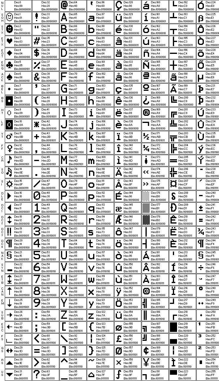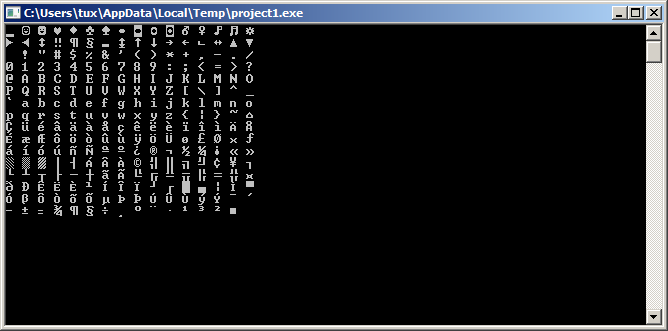 OutCharXY(i mod 16 * 2, i div 16, char(i), 7);