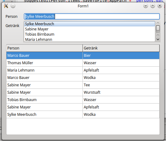 - da das SuggestEdit die Einträge selber in einer TStringList hält, ist bei einfachsten Anwendungen kein weiterer Code notwendig (zufügen von Einträgen erfolgt automatisch, es wird OnNewItem gefeuert, bei einer Nutzung mit einer Datenbank kann dieser Eintrag dort eingetragen oder auch, mit Valid := False, verweigert werden)