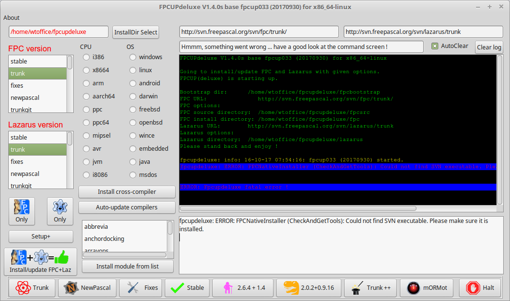 Hab ich gemacht und tatsächlich kriege ich die Meldung : fpcupdeluxe: ERROR: FPCNativeInstaller (CheckAndGetTools): Could not find SVN executable. Please make sure it is installed.