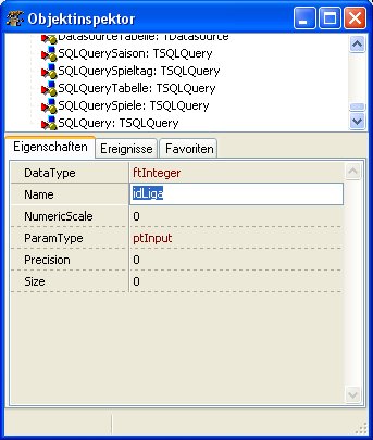 Mein Problem: Ich versuche eine parametrisierte Abfrage zum Laufen zu bringen, damit ordentlich nur die Spiele des jeweiligen Spieltages angezeigt werden. Jedoch wirft mein Programm beim Testlauf die Exception "Parameter "idLiga" not found." Dabei bin ich mir doch ganz sicher, den (wie auch die restlichen Parameter) definiert zu haben, doch der Objektinspektor speichert sie nicht. Habe also das Spiel 2..3x wiederholt (Parameter neu eingegeben u. ausgefüllt), alles ohne Erfolg. (Das einzige, was der Inspector sich merkt ist, dass ich 3 Parameter definiert habe, jedoch nicht deren Inhalt.) Leider habe ich bisher auch keine ordentliche Doku für all die Felder in Params gefunden (DataType, Name, ParamType checke ich ja noch, was jedoch soll/muss ich in Precision, Size und Numeric Scale reinschreiben? Liegt es vielleicht daran, dass da bei mir nix drin steht?). Bin ich zu blöd? Oder ist das ein Fehler? Arbeite unter WinXP mit FPC 2.2.0 und L 0.9.24 und wäre dankbar für jeden Fingerzeig.
