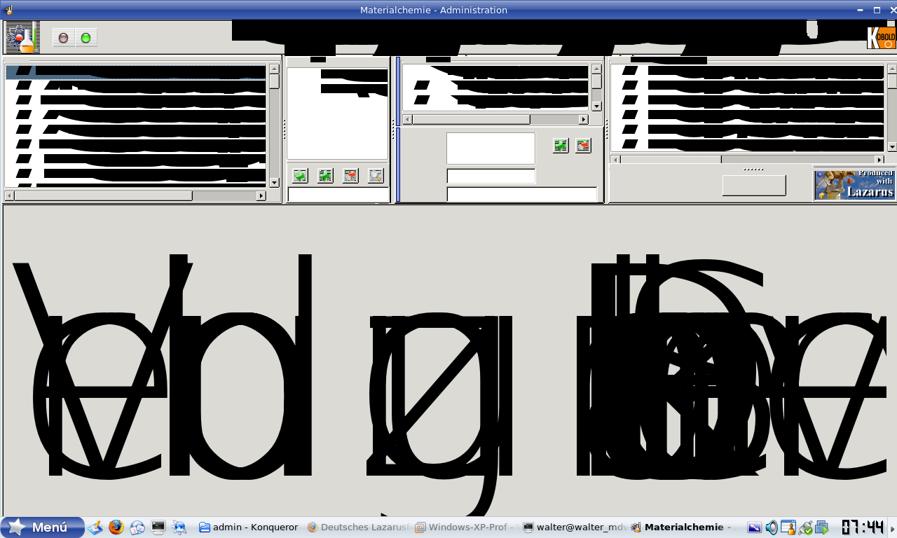 Man beachte jedoch Kleinigkeiten: Alle-Icons und TImages stehen auf dem Kopf, ausser das "produced mit Lazarus"!? Nimmt man aber GTK2 als Widgetset, dann sieht die Anwendung nicht mehr so aus wie gedacht, sondern total verzockt (siehe beide Screenshots). Ich denke aber, dafür gibt es keine Abhilfe, das ist Wine. Nur generell habe ich auch folgende Erfahrung gemacht: Delphi-Programme laufen im Allgemeinen sehr gut mit Wine, andere Programme für Windows, die unter Wine nicht laufen, zeigen irgendwann auch unter Windows direkt ihre Macken und schmieren ab.