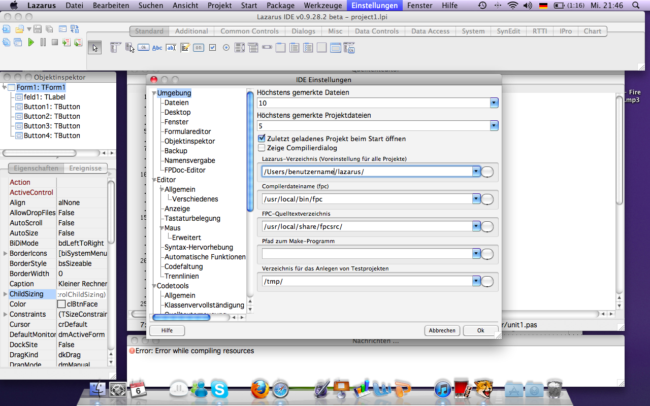 Was verstehst du nicht? Ich weiß gerade nicht, wie ich es noch genauer beschreiben soll.shokwave hat geschrieben: zu 2) Guck doch bitte noch mal unter "Einstellungen/Einstellungen/Umgebung" bei "Lazarus-Verzeichnis" sollte so etwas wie "/Users/<Benutzername>/lazarus" drinstehen (nicht "/usr/local/share/lazarus").