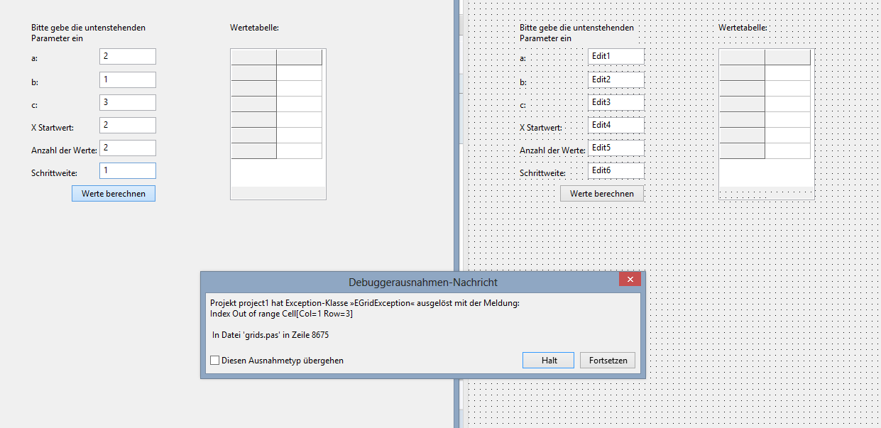 Als Hausaufgabe sollen wir ein Programm schreiben bei dem man die Parameter für eine quadratische Funktion eingibt und dann eine Wertetabelle erstellt wird. Die Eingabe und Berechnung der Y-Werte funktioniert, allerdings hapert es an der Ausgabe mit dieser Fehlermeldung: Index Out of range Cell[Col=1 Row=2} / In Datei 'grids.pas' in Zeile 8675.