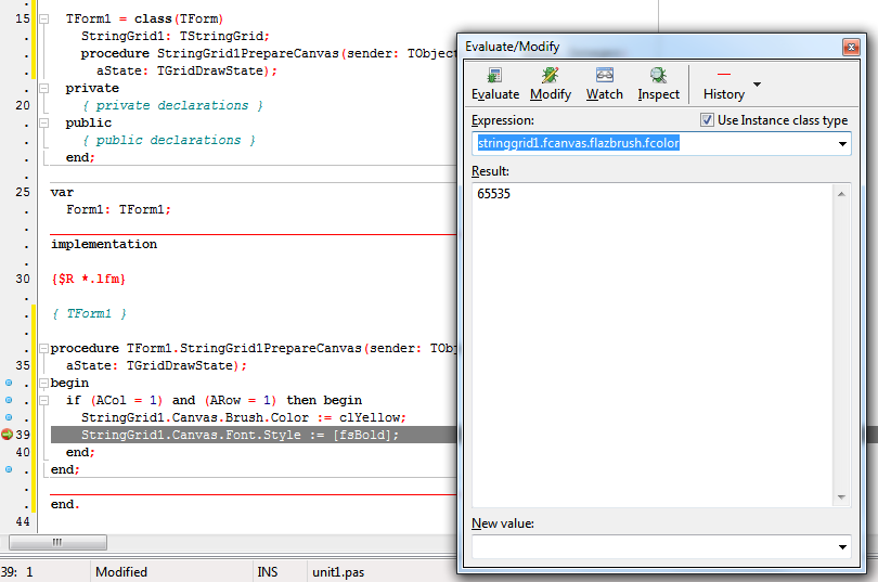 Nein, ich arbeite meisten mit dem "Evaluate/Modify"-Fenster, weil da all die internen Variablennamen angezeigt werden. Wenn ich, wie in dem angehängten Screenshot, die aktuelle Farbe des Canvas-Brush abfragen möchte, wäre es gut, die Farben nicht nur als Dezimalzahl, sondern optional auch als Hexzahl angezeigt zu bekommen. Bei Delphi kann man hierzu ein ",h" an den Abfrageausdruck anhängen, Lazarus sagt aber zu "stringgrid1.fcanvas.flazbrush.fcolor,h" nur "<Error>"