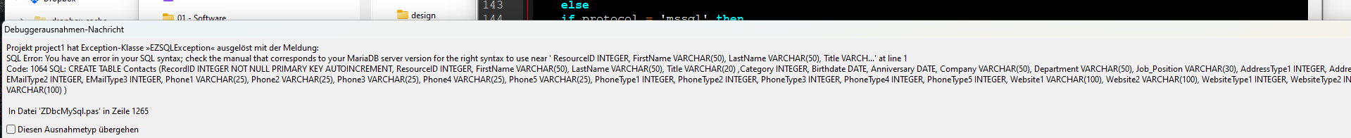 Den ersten Fehler mit dem Create Table konnte ich beheben. Hier fehlte nur ein Komma hinter dem FBoolFieldTypeNameInSQL := 'BIT'; .
