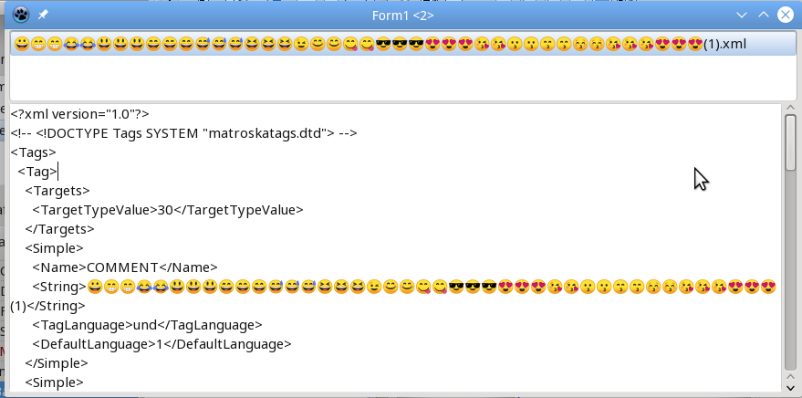 Interessant finde ich das bei dir Alle Emoji's angezeigt werden. Auch bei dem Wert TagString im xml im Memo. Das ist bei MKVToolNix auch nicht der fall.