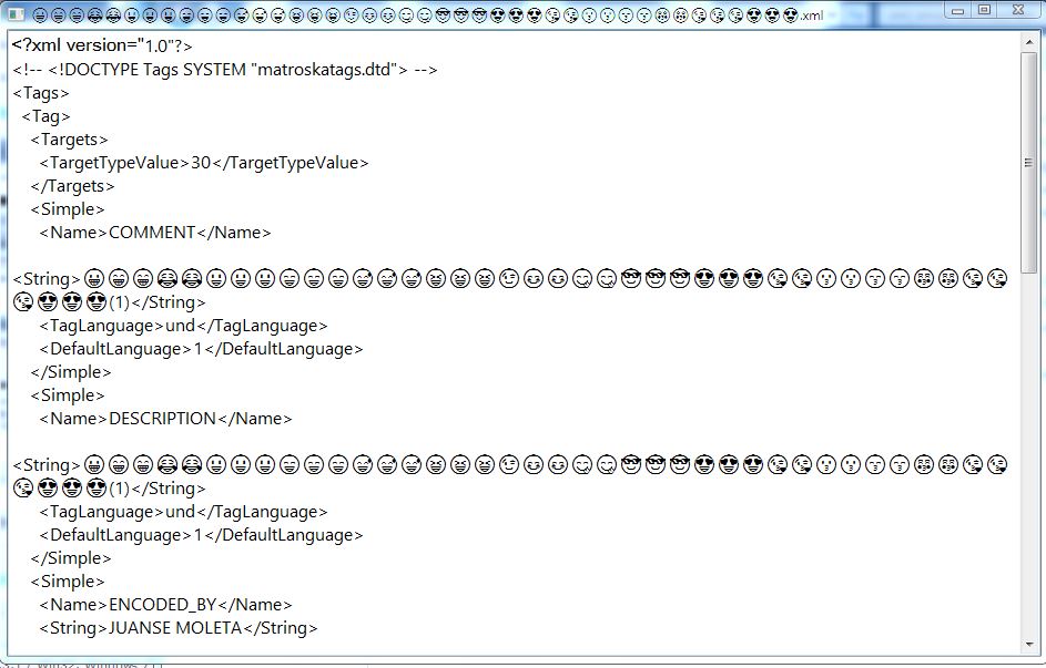 Die Emoji Zeichen sind weiterhin in einer xml oder mkv Datei in einem bestimmten Element gespeichert. Als UTF8 soweit ich das sehe.