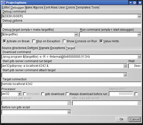 Ich benutze MSEide unter anderem zur Entwicklung von ATMEL AVR32 Programmen, allerdings in C. Debugging mittels gdbproxy, hier die notwendigen Einstellungen: