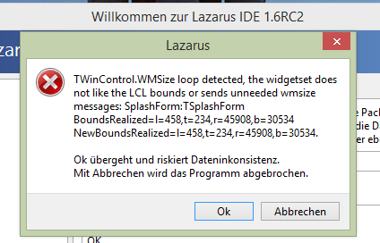 So, jetzt habe ich den RC drauf und kann FP 3.0 nutzen. Beim ersten Start ist mir Lazarus böse abgeschmiert (s. Screenshot). Ich konnte auf OK drücken, sooft ich wollte, die Meldung kam immer wieder. Nur dieser r-Wert von NewBoundsRealized hat sich dabei verändert. Sollte ich das irgendwo melden? Nachdem ich Windows neu gestartet hattte (Win hat sich dabei erstmal 27 Updates reingezogen), läuft Lazarus wie ein Gepard