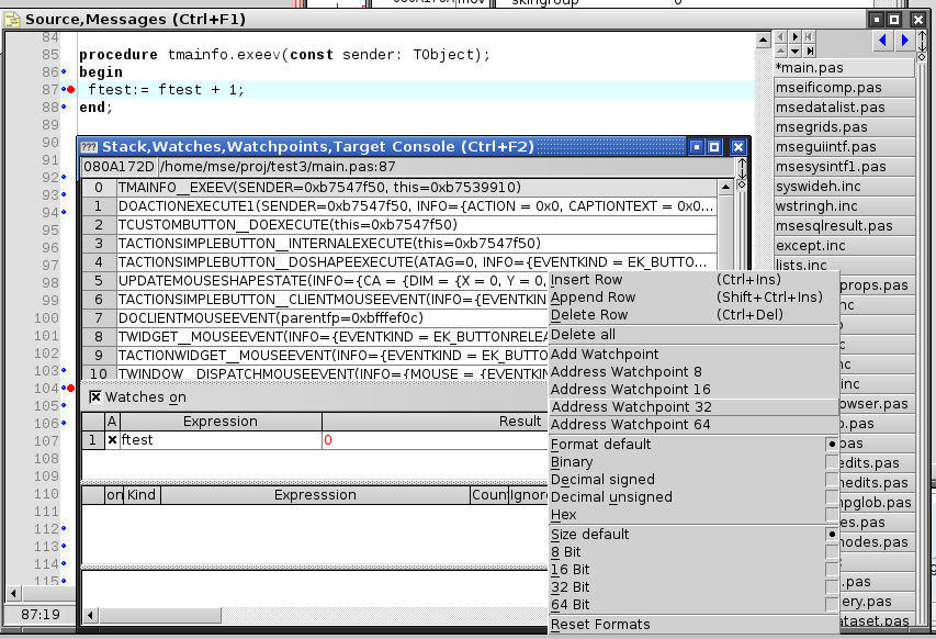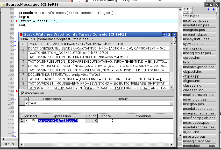 mse hat geschrieben:MSEide hat darum im Watches-Fenster den Popup-Menu Eintrag 'Address Watchpoint *' welcher einen Watchpoint mit der Addresse des im Watch Fenster in der aktuellen Zeile angezeigten Ausdruckes erzeugt. Der Address-Watchpoint verliert seine Gültigkeit während des Programmlaufs nicht.
