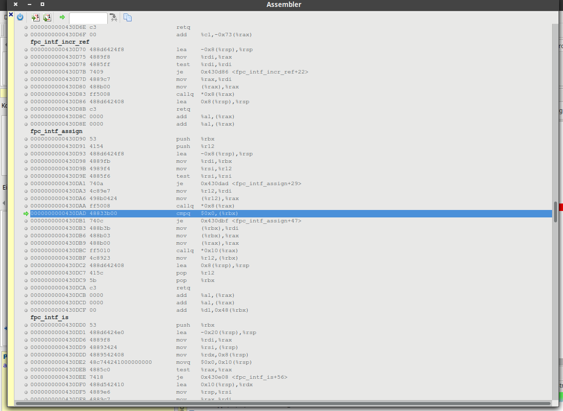 Aber ich habe es endlich geschafft, im Assemblerfenster eine Ausgabe zu sehen. Eventuell kann man da etwas interpretieren: