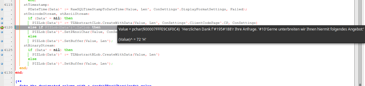 else if PIZLob(Data^)^.IsClob then  // in dieser Zeile tritt das Problem tatsächlich auf (Zeile 4120) - beim Bearbeiten eines TDBMemo
