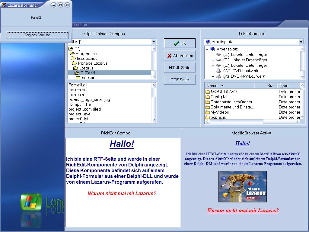 Und zwar geht es darum das ich für in Lazarus nicht existente Komponenten (RichEdit, Dateimanager, WebBrowser) eine Formular-DLL in Delphi mache und die dann mit einem Lazarusprogramm benutze. :lol: Also, das fertige Formular vom Lazarusprogramm aus aufrufe und benutze oder zum beispiel in einem Panel auf dem Lazarusformular anzeige. :roll:
