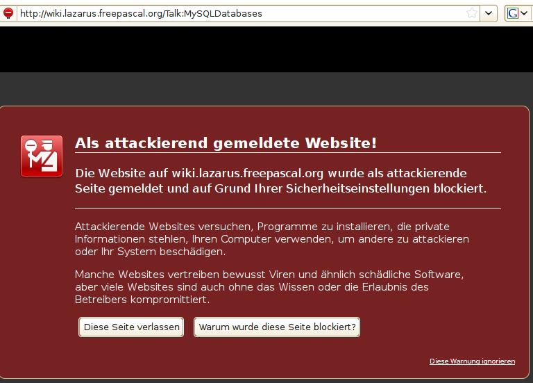 Wenn man bei google "Lazarus" beispielsweise eingibt, dann auf den Link zu http://www.lazarus.freepascal.org" onclick="window.open(this.href);return false; klickt, sticht einen folgende Warnung ins Auge: