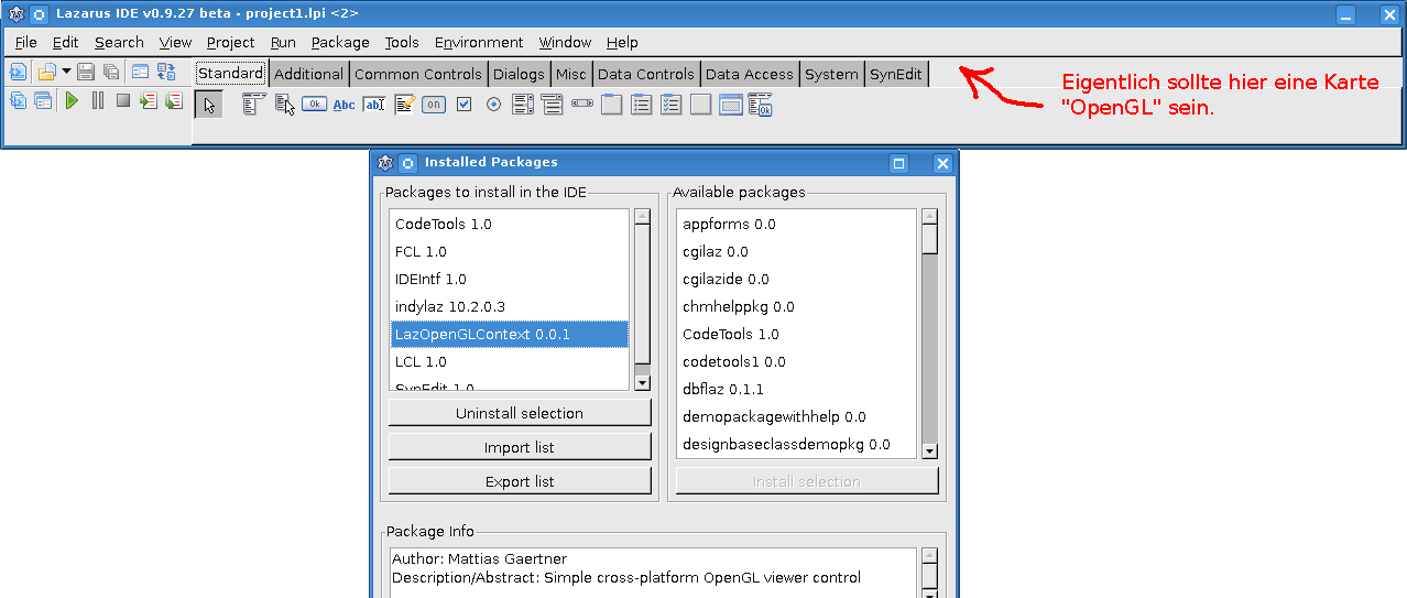 Und nachdem ich gesehen habe das meine LazOpenGLContext Componente eine xpm Datei besitzt. Bin ich der Meinung das nach erfolgreicher Installation ein Icon von OpenGLContext in der IDE sichtbar sein müste.