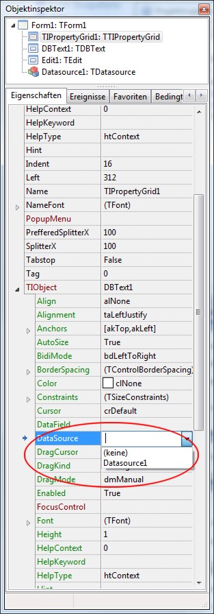 zunächst muss mal eine DataSource auf dem Formular sein und der Datentyp muss TDataSource sein,