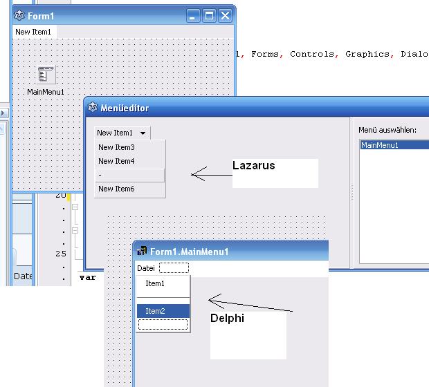 In deinem Screenshot vergleichst du die Delphi Form mit dem lazarus Menueditor wenn du dir die Lazarus Form anschaust sieht alles genauso aus.