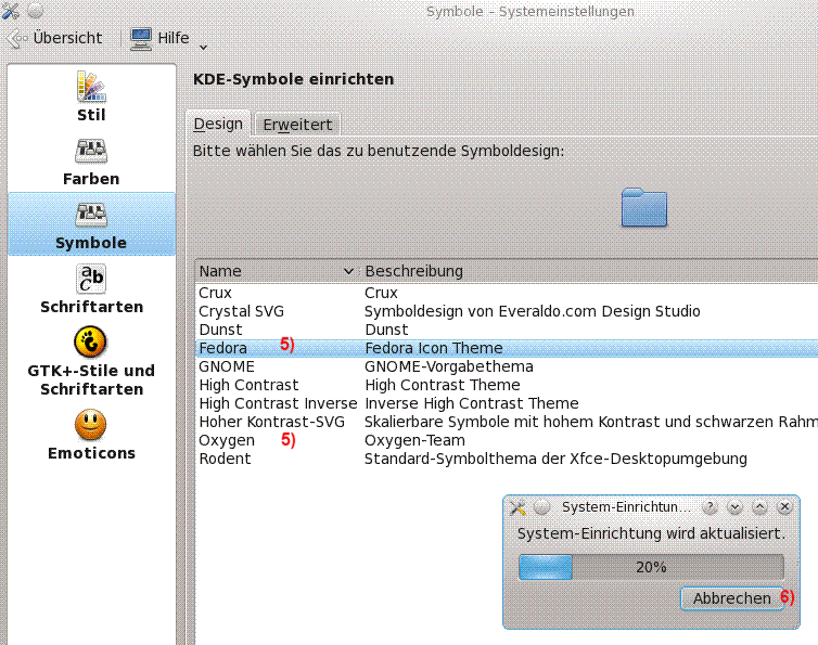 ich hab meine Icons leider noch nicht wieder zurück. :( Mein Rechner ist allerdings quälend langsam, wenn ich darin KDE starte. Ich kann da nicht einfach drauf los probieren. So ganz hab ich auch den Einstellungspfad in meinem Fedora 14 nicht nachvollziehen können. Hier ist, was ich versucht hab. Beachte bitte die Fußnoten in den Bildern. Weiß noch wer Rat, wie ich meine Icons im Lazarus Menü zurück kriege?