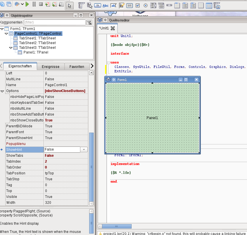 Das PageControl hat immer die gleiche Farbei wie das Form. Bei TNotebook kannst du die Farbe ändern.1660 hat geschrieben:Am PageControl stört mich eigentlich nur der weiße Hintergrund.