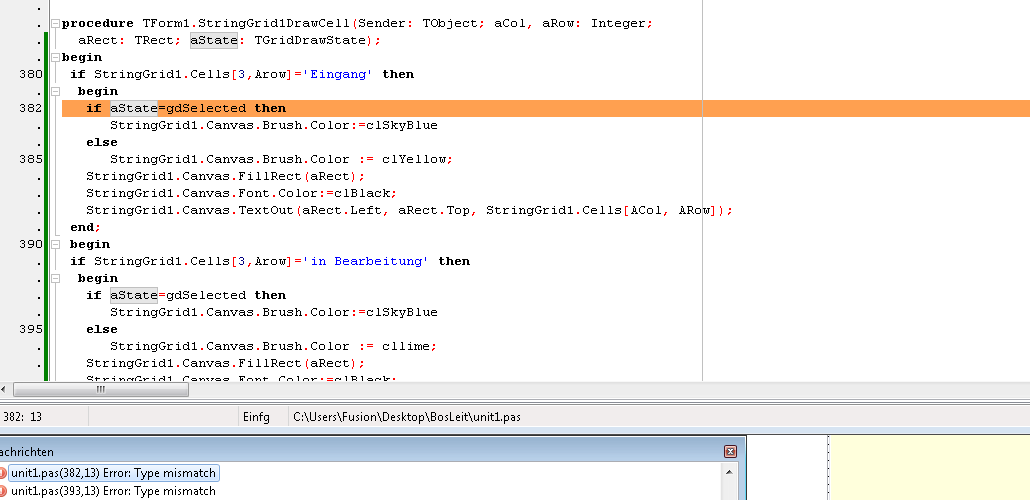 if StringGrid1.Cells[3,Arow]='In Bearbeitung' then