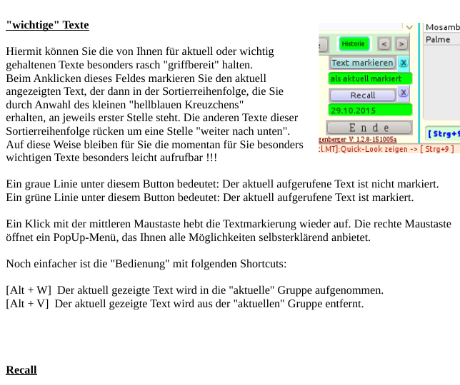 Mit jedem neuen Eintrag wandern also die bereits vorhandenen Einträge "nach hinten". Drückt man aber erneut den Button "Text markieren", so erhält dieser Eintrag mit dem genannten "Update"-Befehl erneut das aktuellste Datum und steht somit wieder ganz "oben". Immer wenn also ein Texteintrag, der besonders wichtig ist, zu weit nach unten zu rutschen droht, genügt ein Klick auf den "Text markieren"-Button.