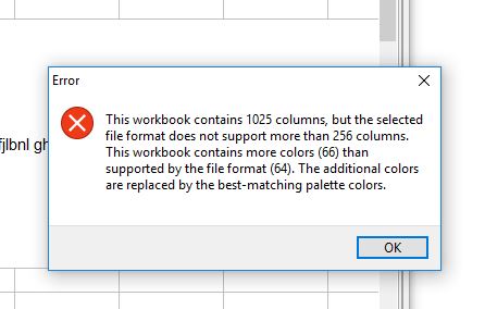Generell unterstützt FPSpreadsheet beliebig viele Spalten, Zeilen und Farben. Wenn das Worksheet aber in einer Datei gespeichert wird, müssen die Einschränkungen des jeweiligen Dateiformats beachtet werden. So kommt es ggfs. zu der genannten Fehlermeldung - wobei das programmintern nur eine Warnung ist, um den Benutzer darauf hinzuweisen, dass möglicherweise etwas falsch gespeichert wurde. Könnte es sein, dass die Datei vorher irgendwie in Libre/OpenOffice war? Hier hat Calc das Problem, dass beim Importieren von Excel-Dateien der volle Range an Spalten und Zeilen angelegt wird.