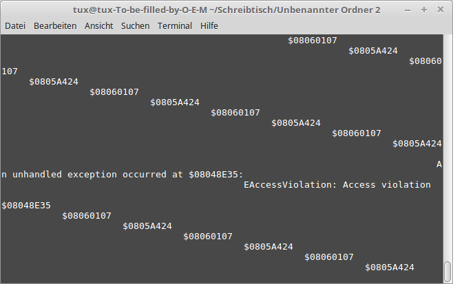 Genau das gleiche erhalte auch ich. Deshalb dieser Strang. Offenbar baut der Compiler hier Mist. Wäre es nur meine ungeeignete Lazarus Version oder fehlerhafte Konsolenanbindung an mein Lazarus, dann müsste es ja bei Dir funktionieren. Der Code den der Compiler erzeugt, ist ja derselbe, egal welche Linuxdistribution verwendet wird.