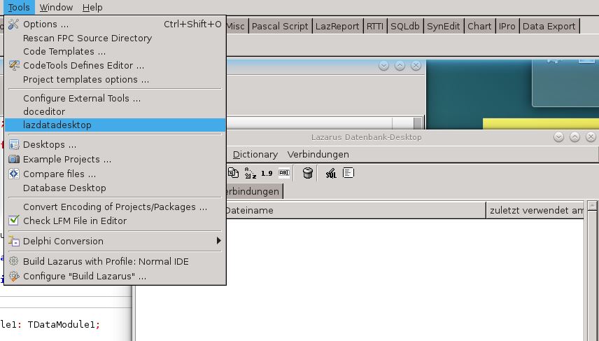 Den Daten-Desktop findest du im Ordner tools/lazdatadesktop der Lazarus-Installation, Muss vor 1.Anwendung erst kompiliert werden (einfach zugehöriges .lpi laden). Siehe auch: http://wiki.freepascal.org/lazdatadesktop